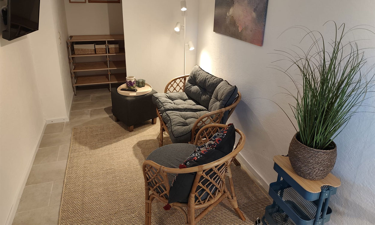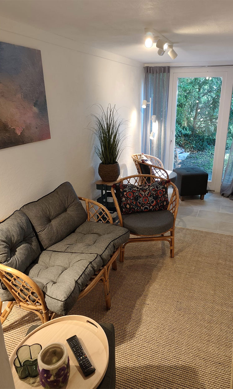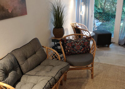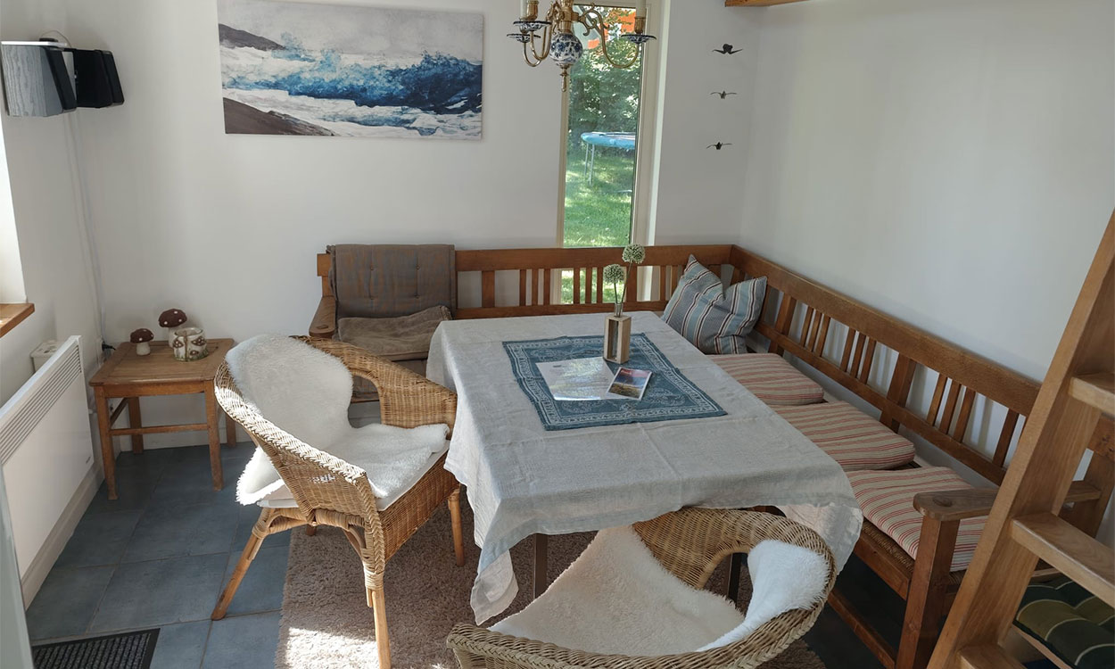 Mit Rohr gedeckt verzaubert die Kleine Villa schon beim Eintreten in den Essbereich mit integrierter Küchenzeile durch ihren besonderen Charme. Fernseher und Audioanlagen einschließlich einer kleinen Auswahl von CDs gehören ebenso zur Ausstattung wie auch einige spannende Krimis und andere Bücher.