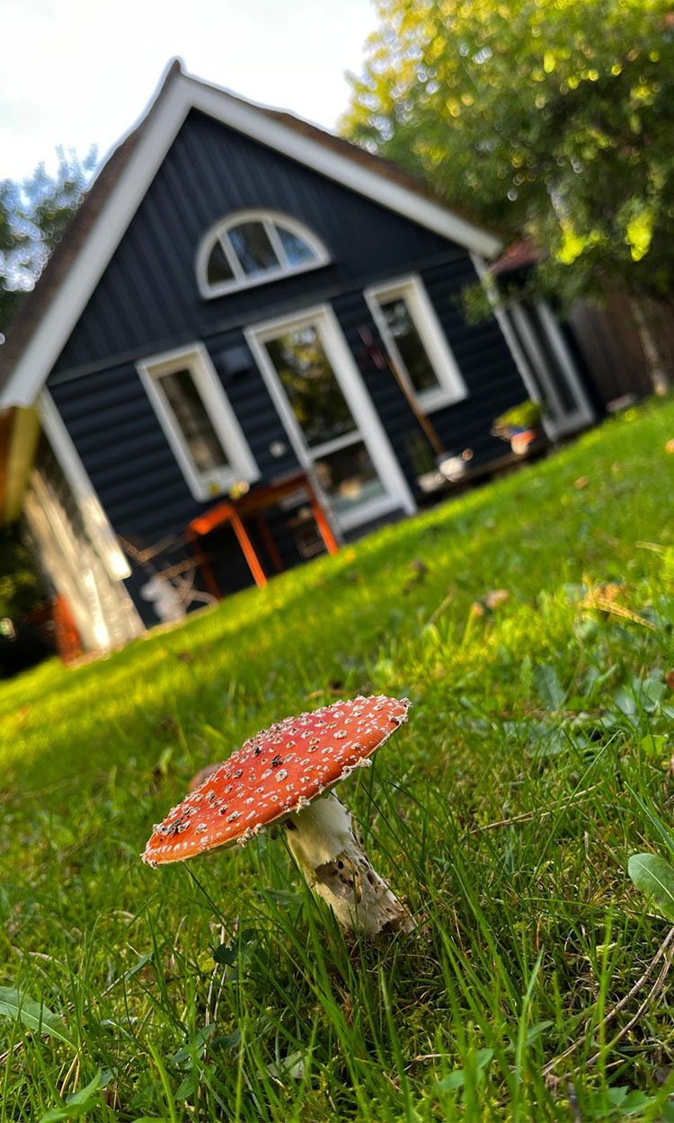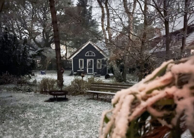 Oben auf der über eine Leiter zu erreichende offenen Schlafempore mit zwei Einzelbetten (100 x 200cm) fühlen sich Kinder pudelwohl. Von dort aus hat man einen besonderen Blick durch das Giebelfenster in die hohen Bäume des Gartens. Die Erwachsenen träumen in einem separaten Schlafzimmer mit einem bequemen Doppelbett (180 x 200cm) und Blick in den Garten. Frühmorgens ist auch schon einmal ein Hase auf der Wiese vor der Kleinen Villa zu beobachten. In dem kleinen Duschbad findet man alles, was man braucht. Die Küche der Kleinen Villa verfügt über Kochfeld, Backofen, Geschirrspüler, Kühlschrank mit kleinem Gefrierfach, Kaffeemaschine und Wasserkocher. Zudem verfügt die Kleine Villa über ein separates kleines Wohnzimmer mit einem abgetrennten Bereich für Kleidung und Gepäck.